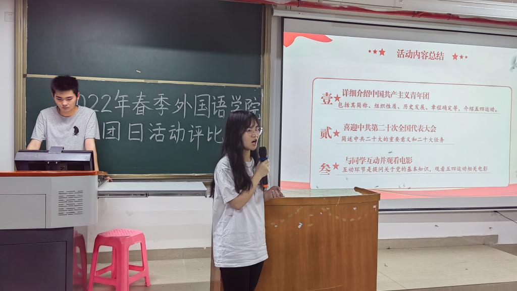 本次团日活动的评比主题为:喜迎二十大、永远跟党走、奋进新征程。各班级派代表上台展示班级团日活动成果,比赛形式分为三分钟展示加两分钟答辩。各班级积极组织本次活动,充分展现了班级内部的凝聚力。其中,颇具特色的红船精神、云参观博物馆等活动让现场观众赞不绝口。最后,21英语4班获得本次团日活动评比一等奖,21英语5班获得二等奖,21英语7班、21日语2班并列三等奖。